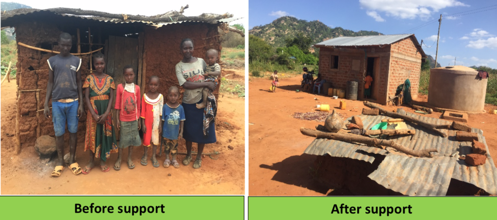 Kanini är ensamstående mor med sju barn, här framför tidigare bostaden samt det nya huset med tank som byggts till höger
